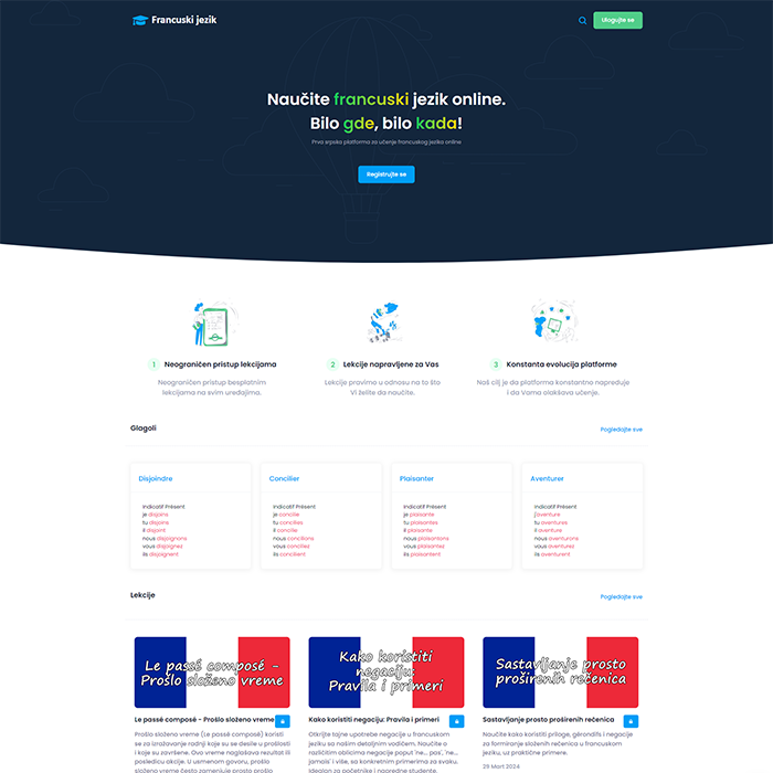 Development of a French language learning platform with vocabulary, conjugation, quizzes, online lessons, developed analytics, etc.